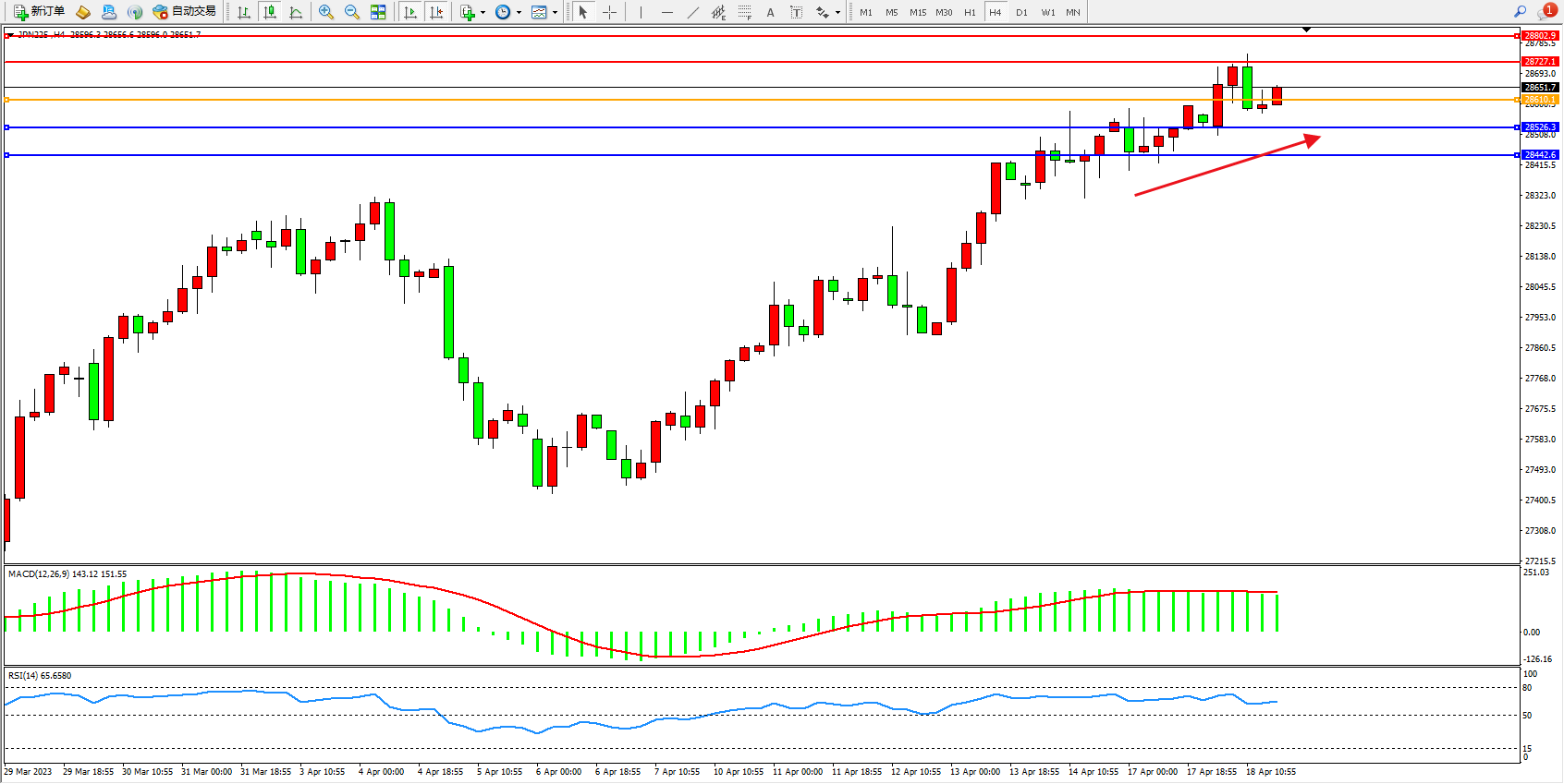 日经指数JPN225——4小时K线图显示: