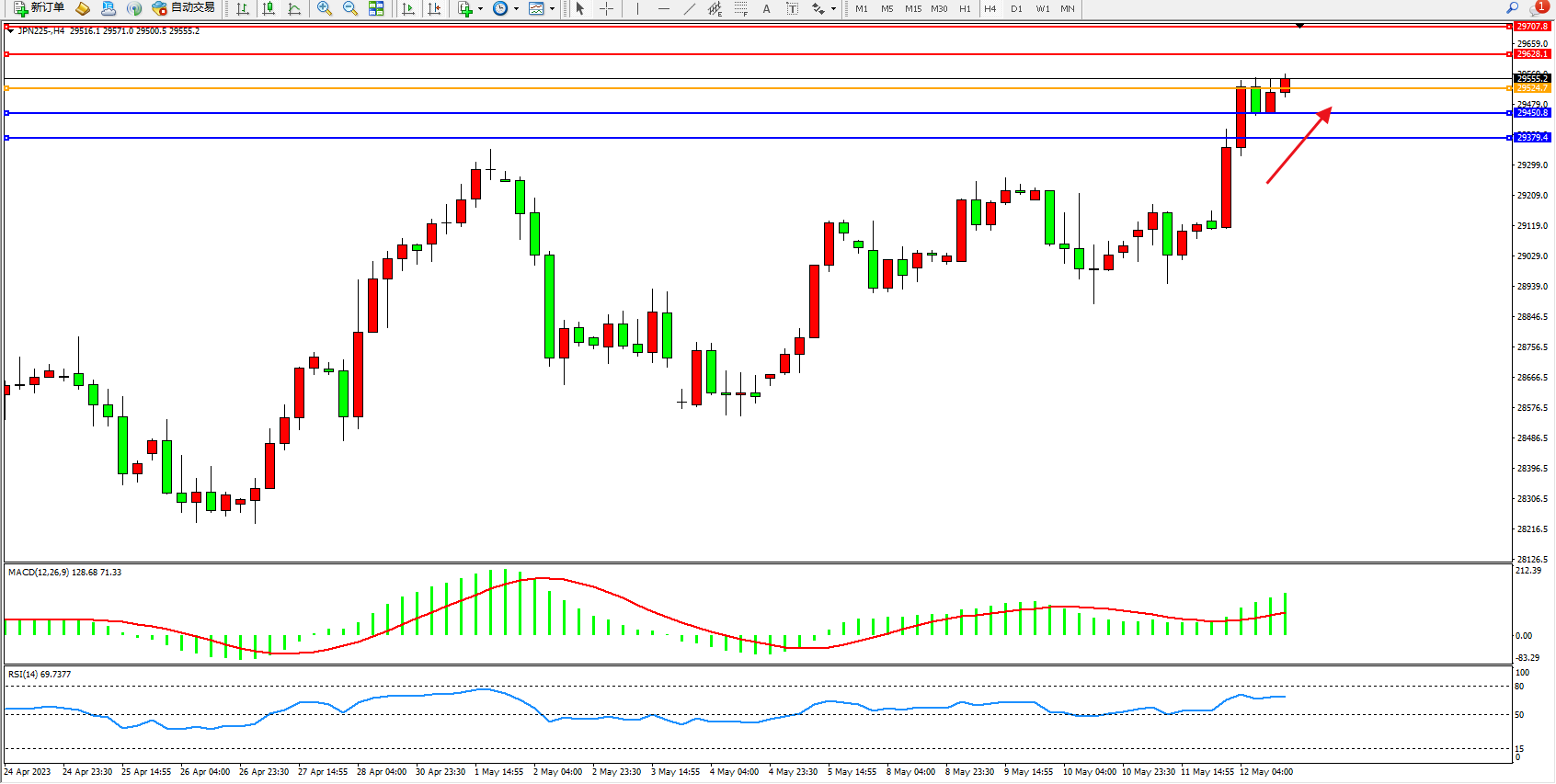 日经指数JPN225——4小时K线图显示:
