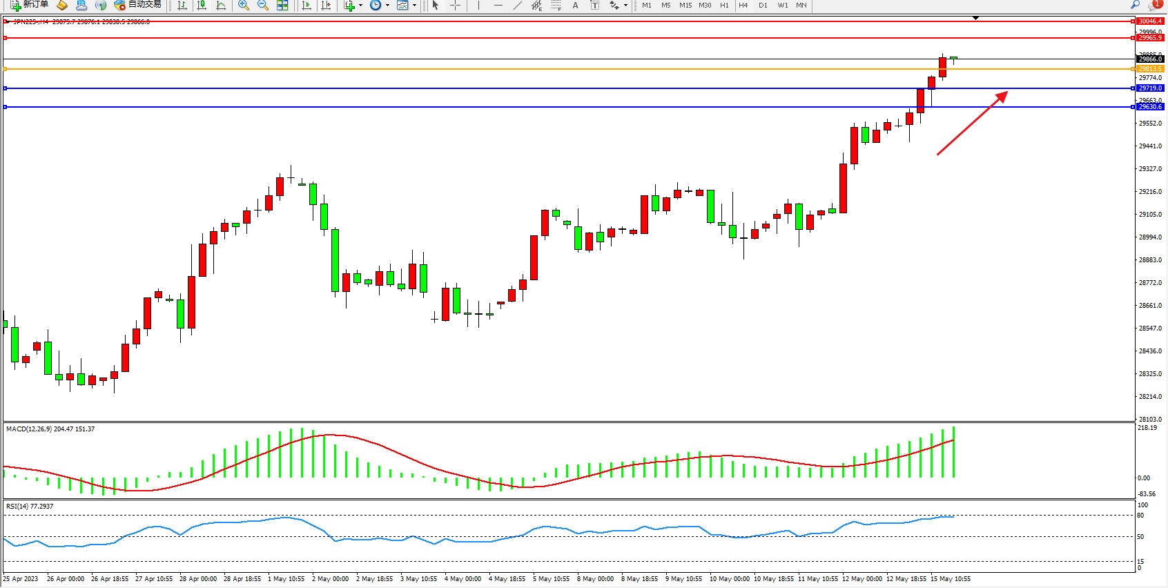 日经指数JPN225——4小时K线图显示: