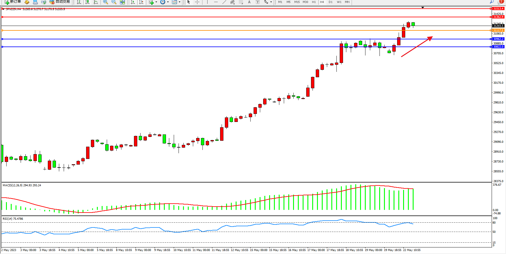 日经指数JPN225——4小时K线图显示:
