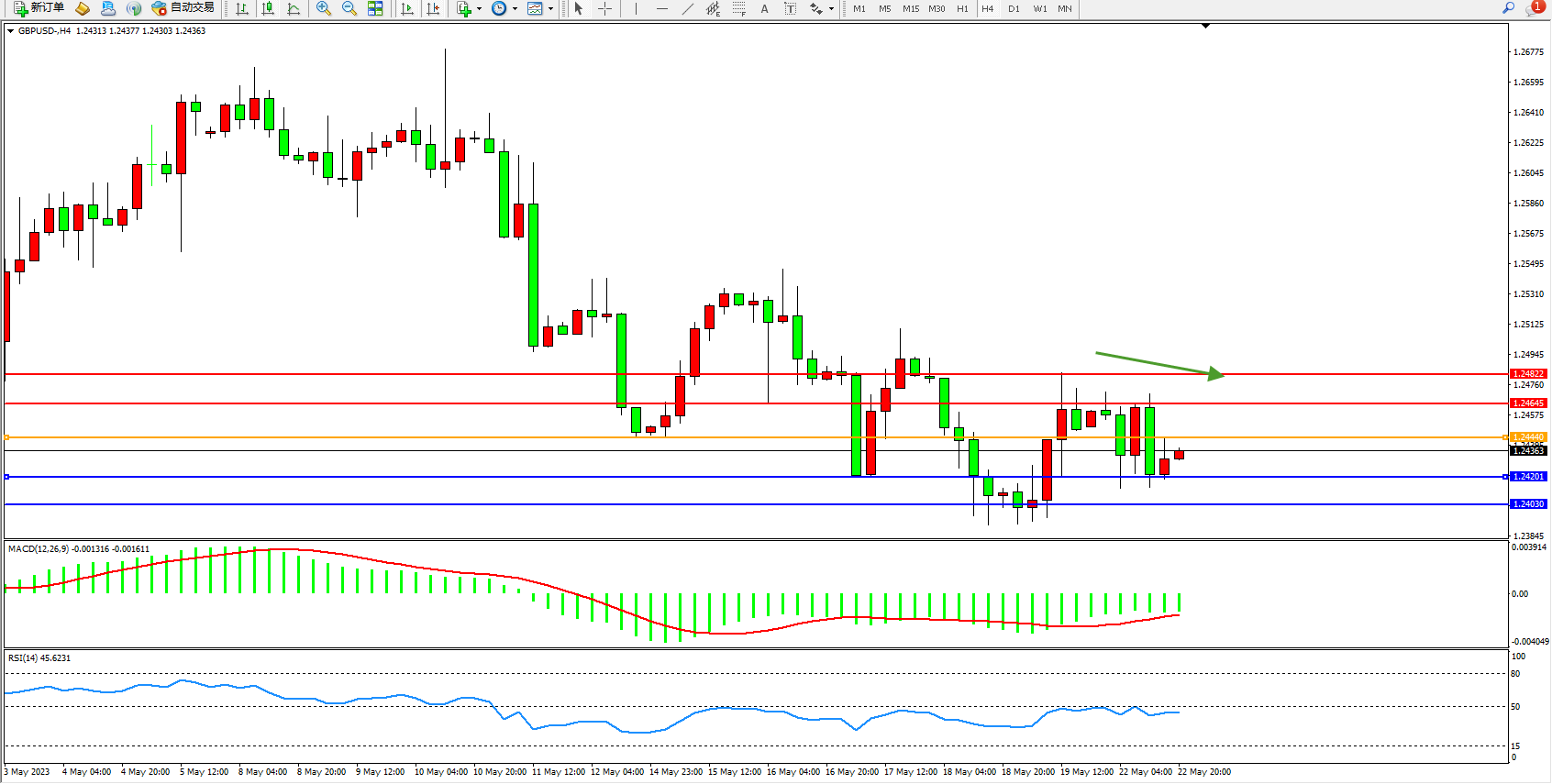 交易策略:1.24440下方看跌,目标1.24201  1.24030