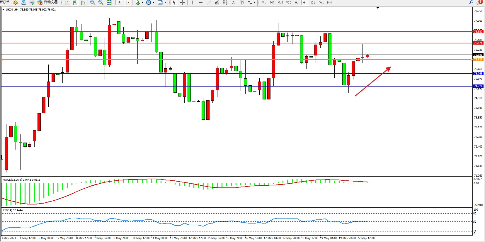 交易策略:75.825上方看涨,目标76.471 76.922
