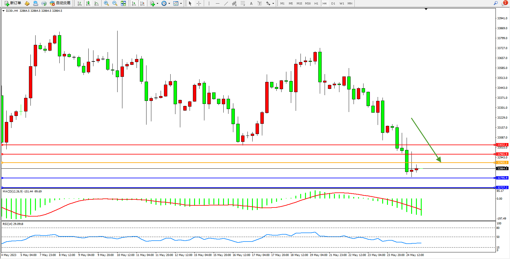 道琼斯指数DJ30——4小时K线图显示: