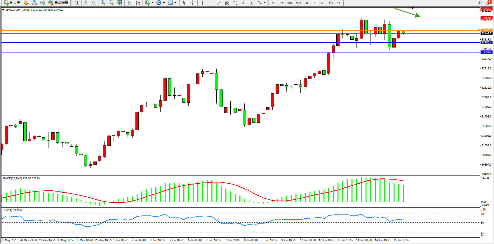 日经指数JPN225——4小时K线图显示: