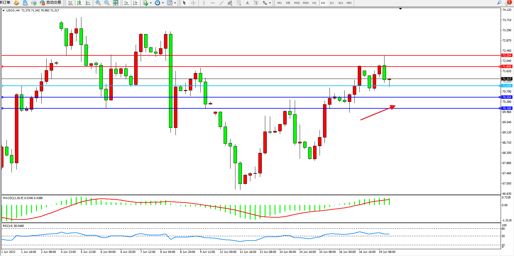 原油USOil——4小时K线图显示:
