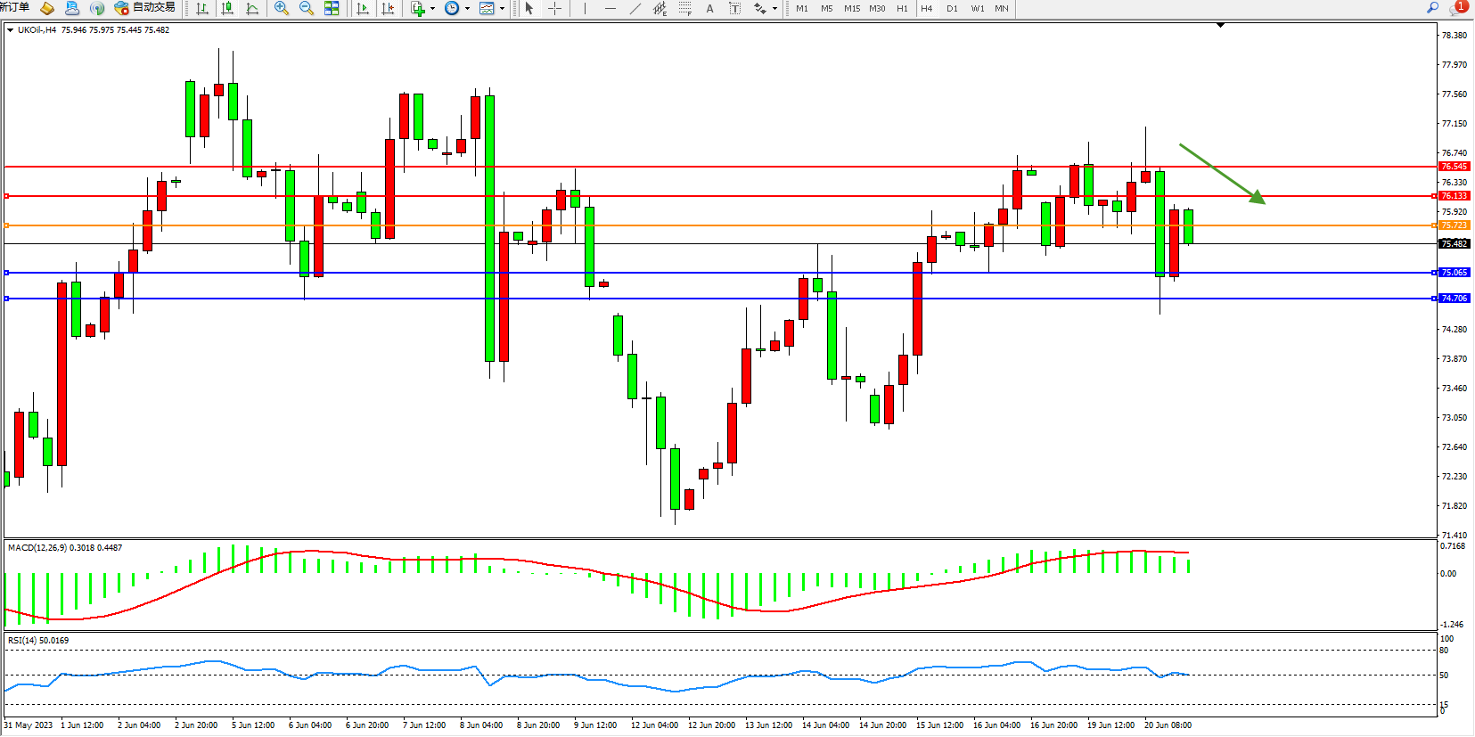 交易策略:75.723下方看跌,目标75.065 74.706