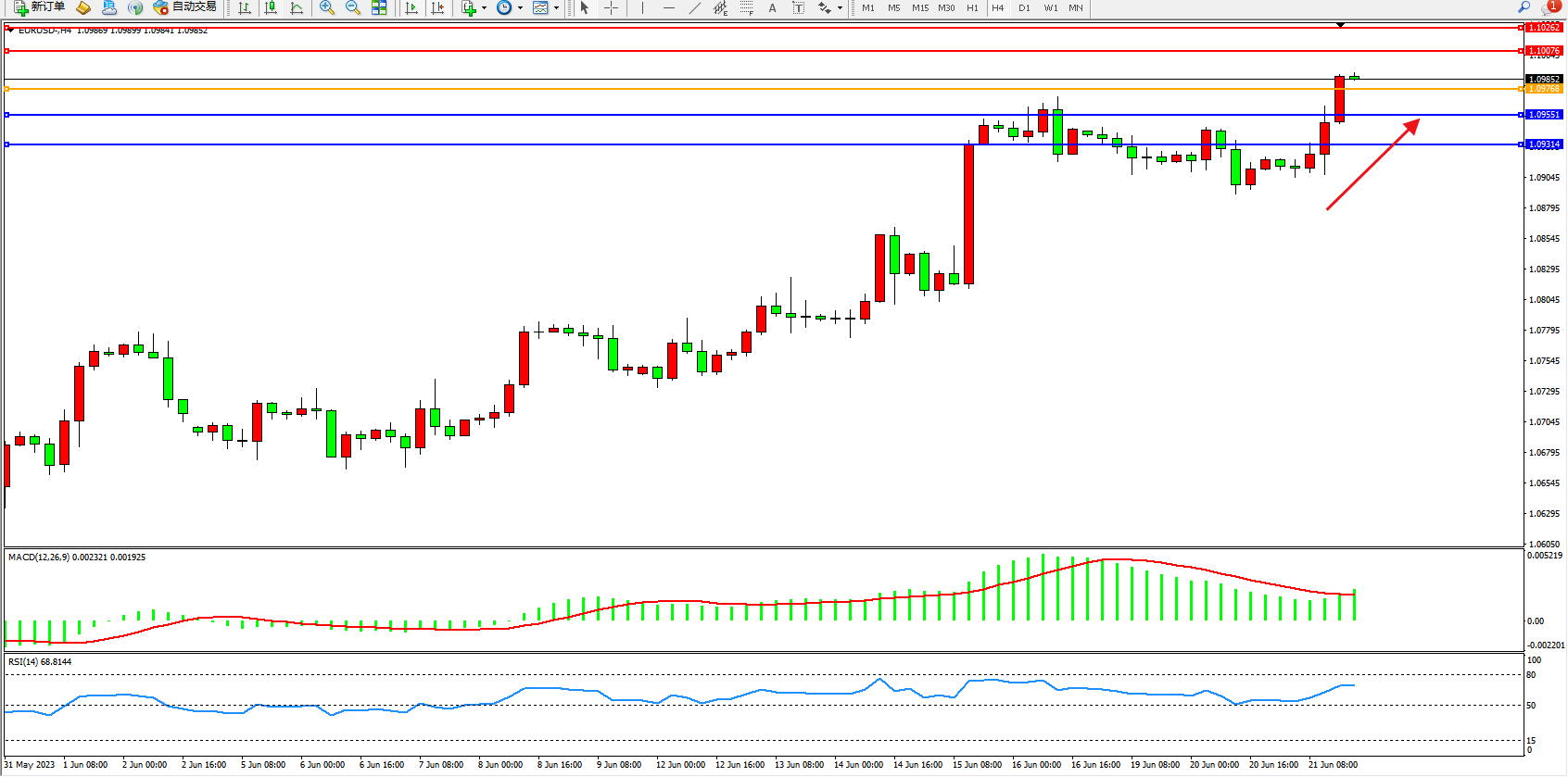 交易策略:1.09768上方看涨,目标1.10076 1.10262