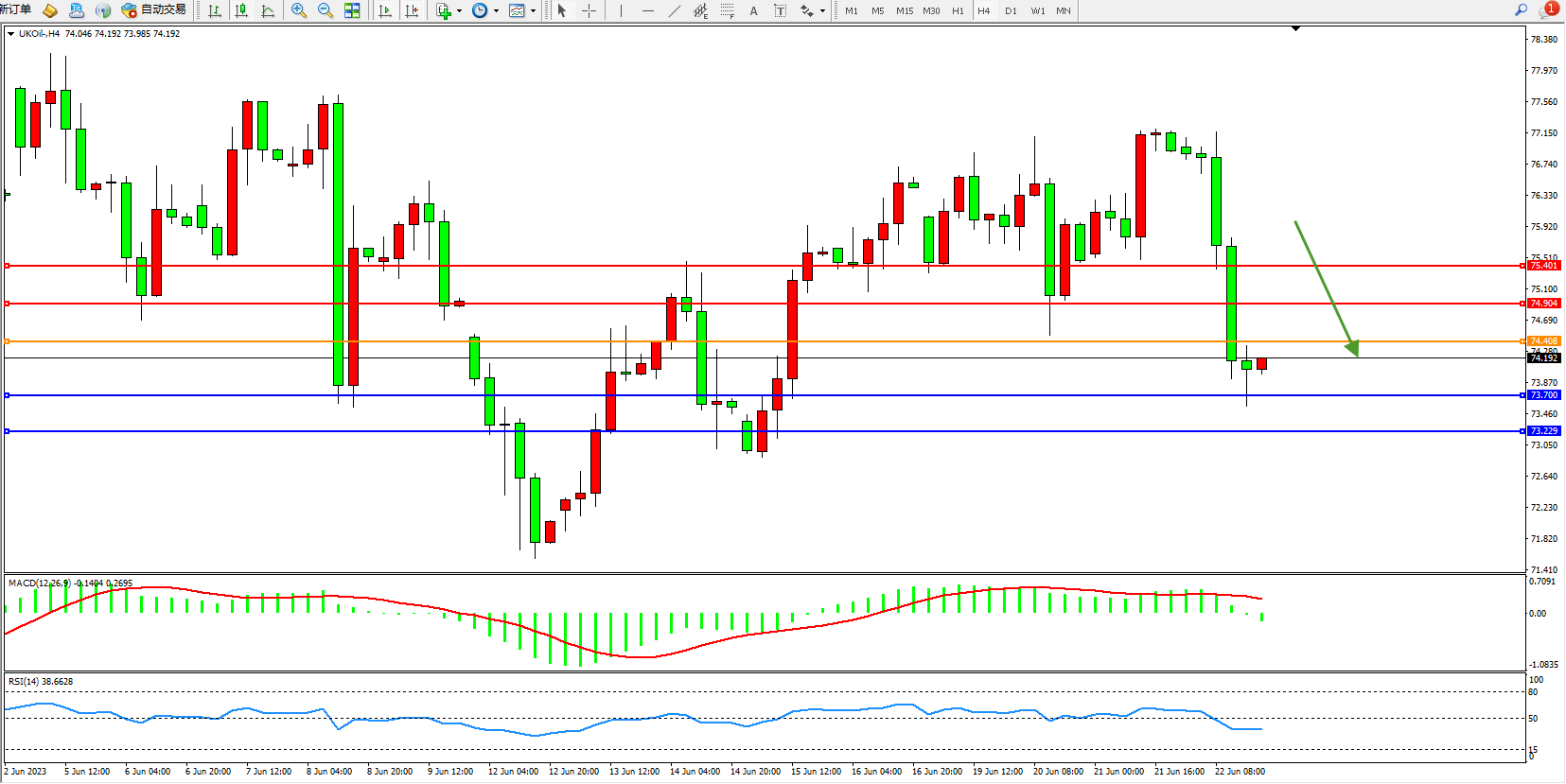 交易策略:74.408下方看跌,目标73.700  73.229