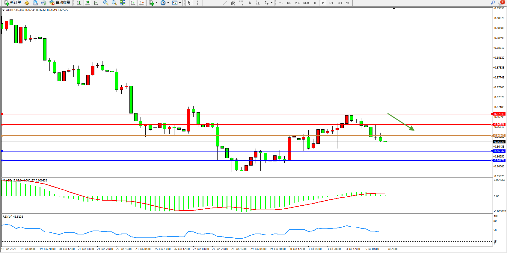交易策略:0.66642下方看跌,目标0.66347 0.66172
