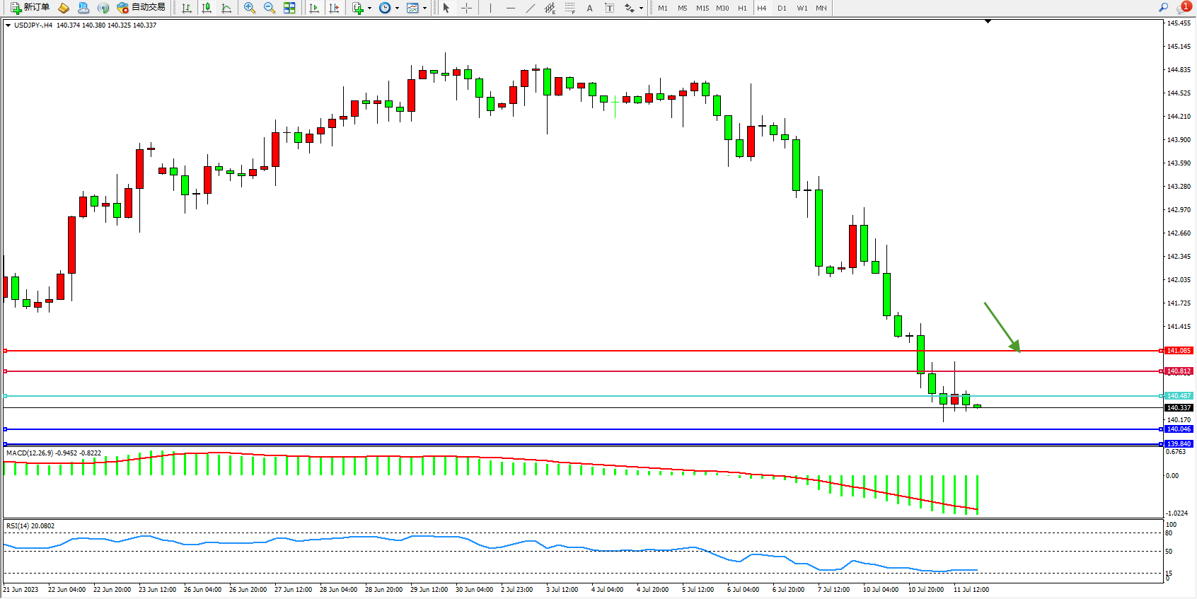 交易策略:140.487下方看跌,目标140.046 139.840