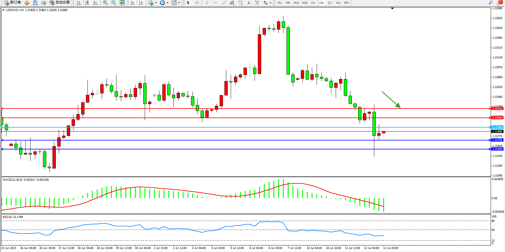 4小时图看:多头动力强势攀升,市场看涨情绪笼罩,短期有继续向上拉升态势,MACD指标处于多头区域强势拉升,RSI指标处于多头区域高位整理;