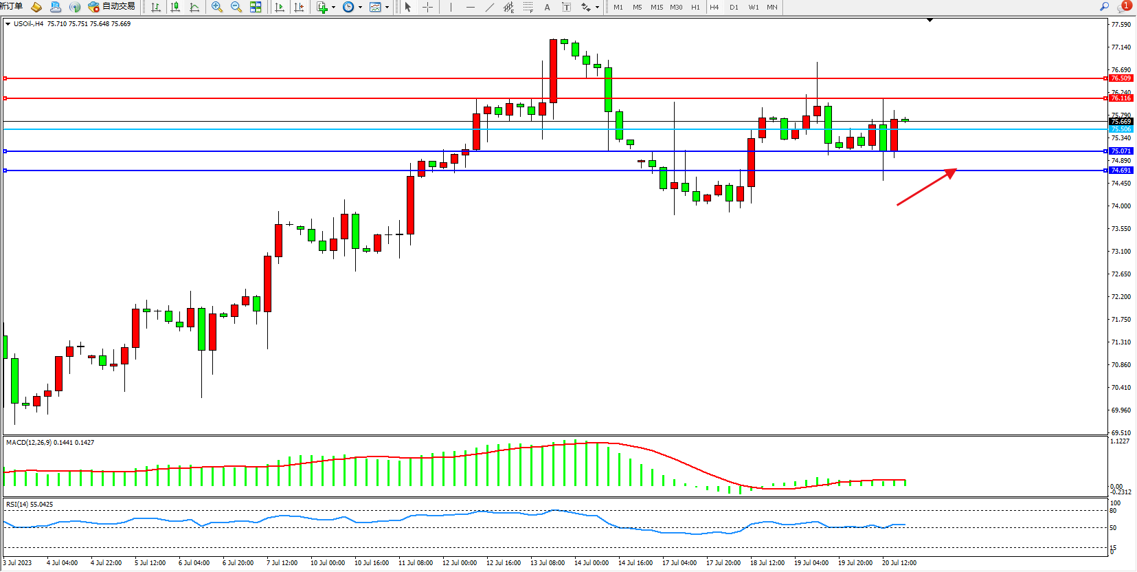 交易策略:75.506上方看涨,目标76.116 76.509