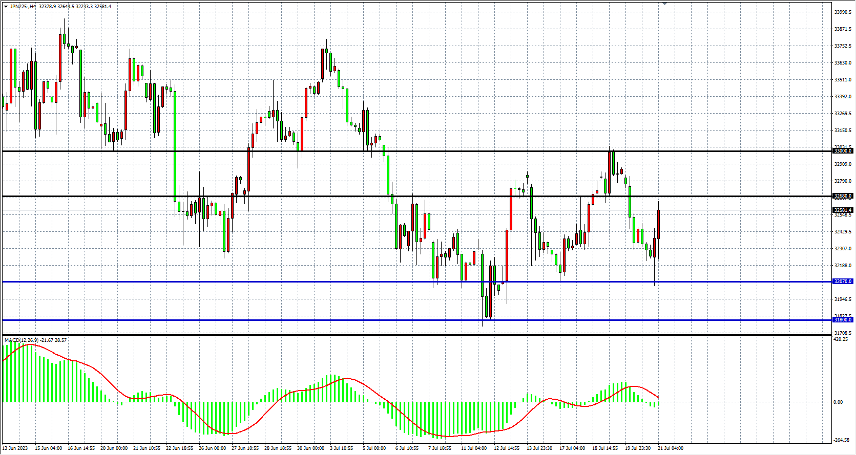 4小时图看,日经指数回调前低点32000一线再度止跌反弹,MACD量能于零轴下缩量,行情进入宽幅整理,阻力关注32680-33000,支撑关注32070-31800。