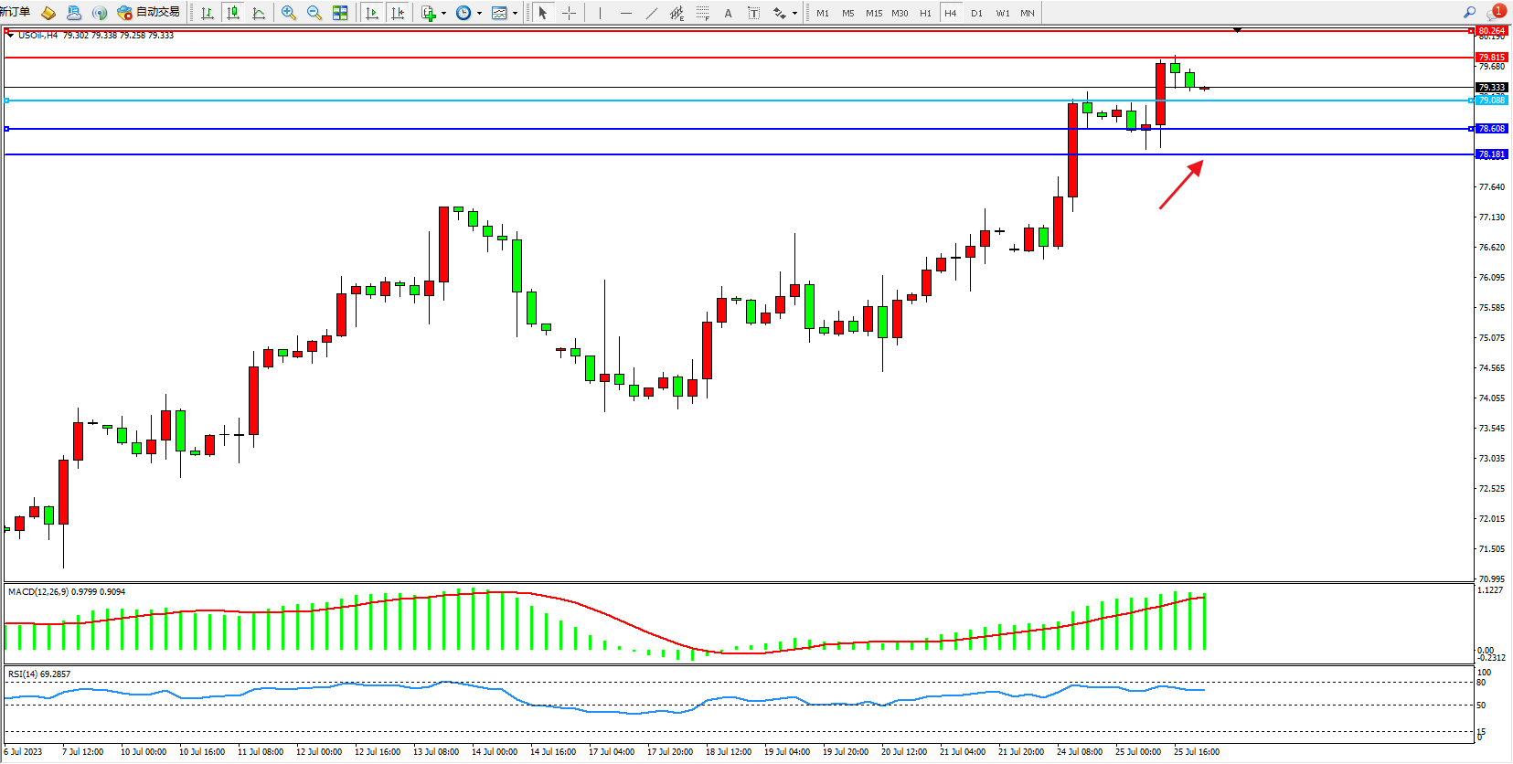 原油USOil——4小时K线图显示: