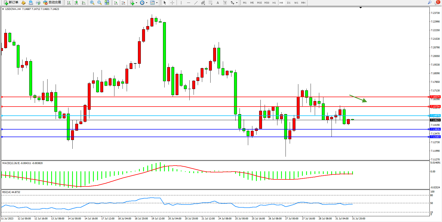 交易策略:7.14978下方看跌,目标1.13826  7.13183