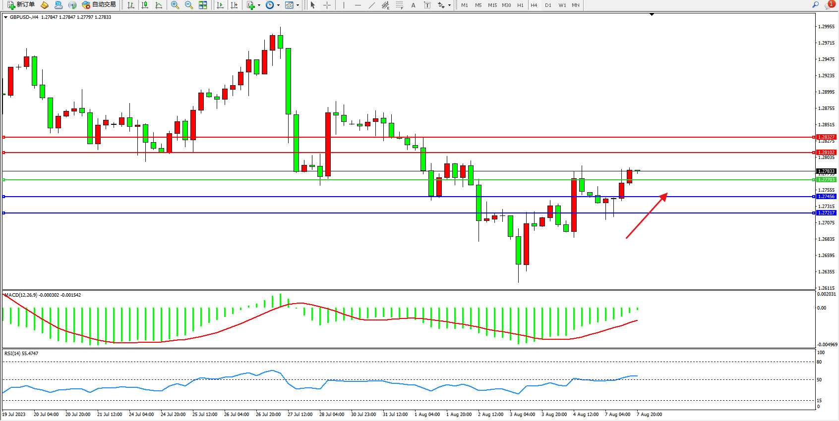 英镑美元GBPUSD ——4小时K线图显示: