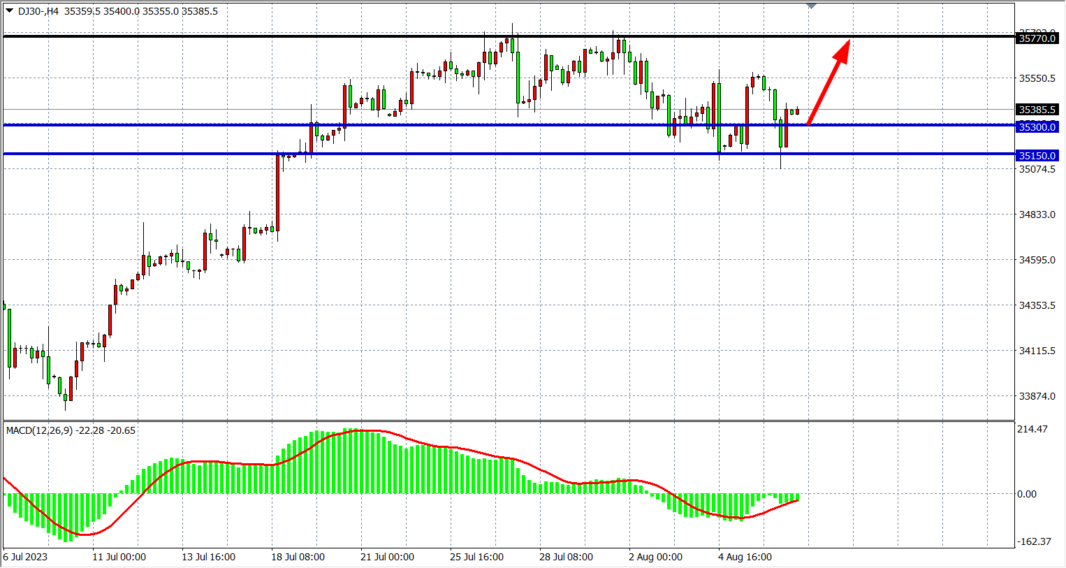 4小时图看,道指在35150附近受支撑反弹,MACD在零轴下缩量,行情继续维持高位整理,支撑关注35150-35300,阻力关注35770。