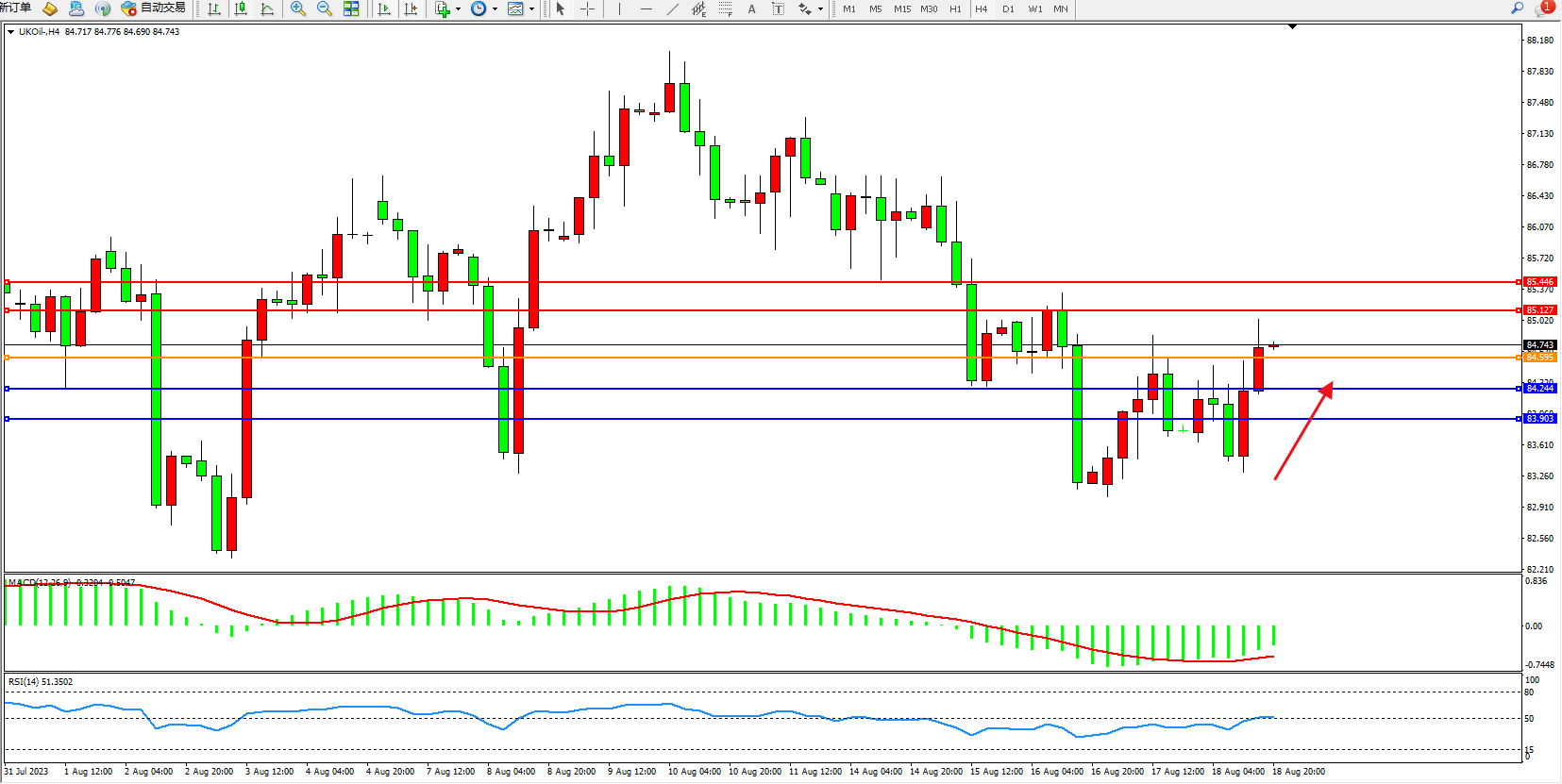 4小时图看:多头动力维持震荡上移,短期看涨情绪涌现,市场多头动力持续,MACD指标处于空头区域整理上移,RSI指标处于50均衡线附近徘徊;