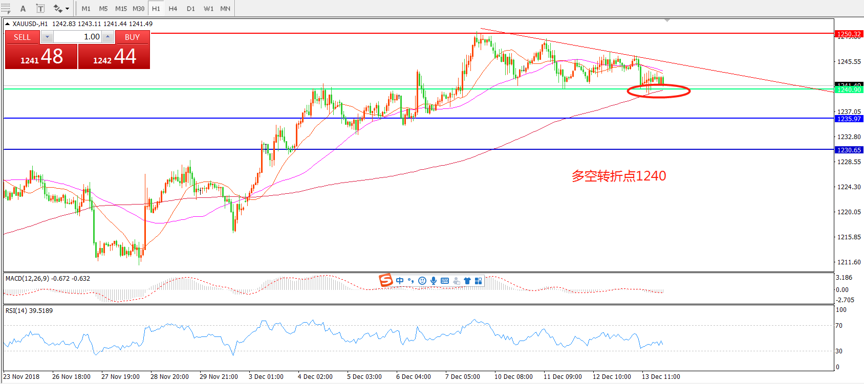 小时图看,黄金短期震荡回落,高点逐渐见底后有陷入整理的迹象,但1240支撑依然有效, MACD绿柱缩短,短期走势仍应依然以多头思路对待。