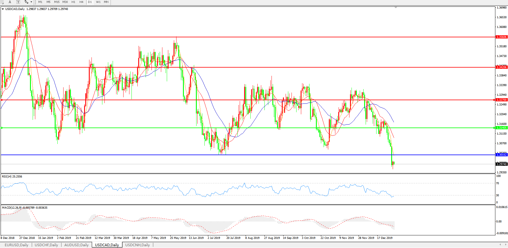 技术面简析:日线图均线呈空头排列,汇价跌破1.3140关口后加速下行并持续扩大跌幅,MACD持续下行且量能0轴下方再度加速放量,RSI震荡走低,预计汇价大概率将进一步下行。