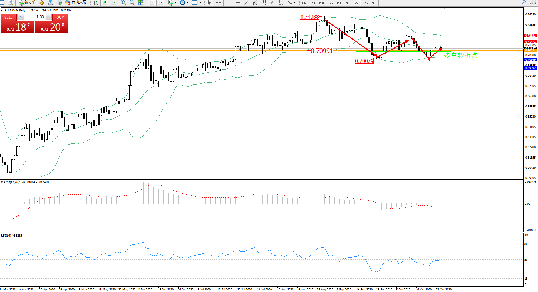 交易策略:0.70991上方看涨,目标0.71772、0.72351