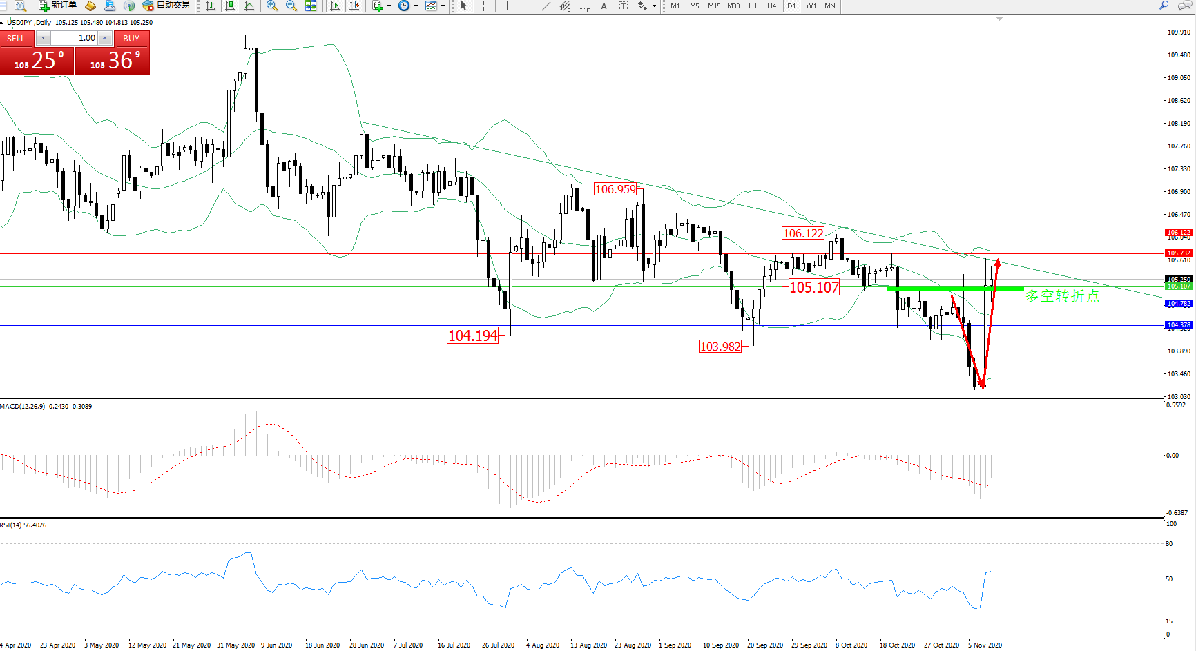 交易策略:105.107上方看涨,目标105.732、106.122