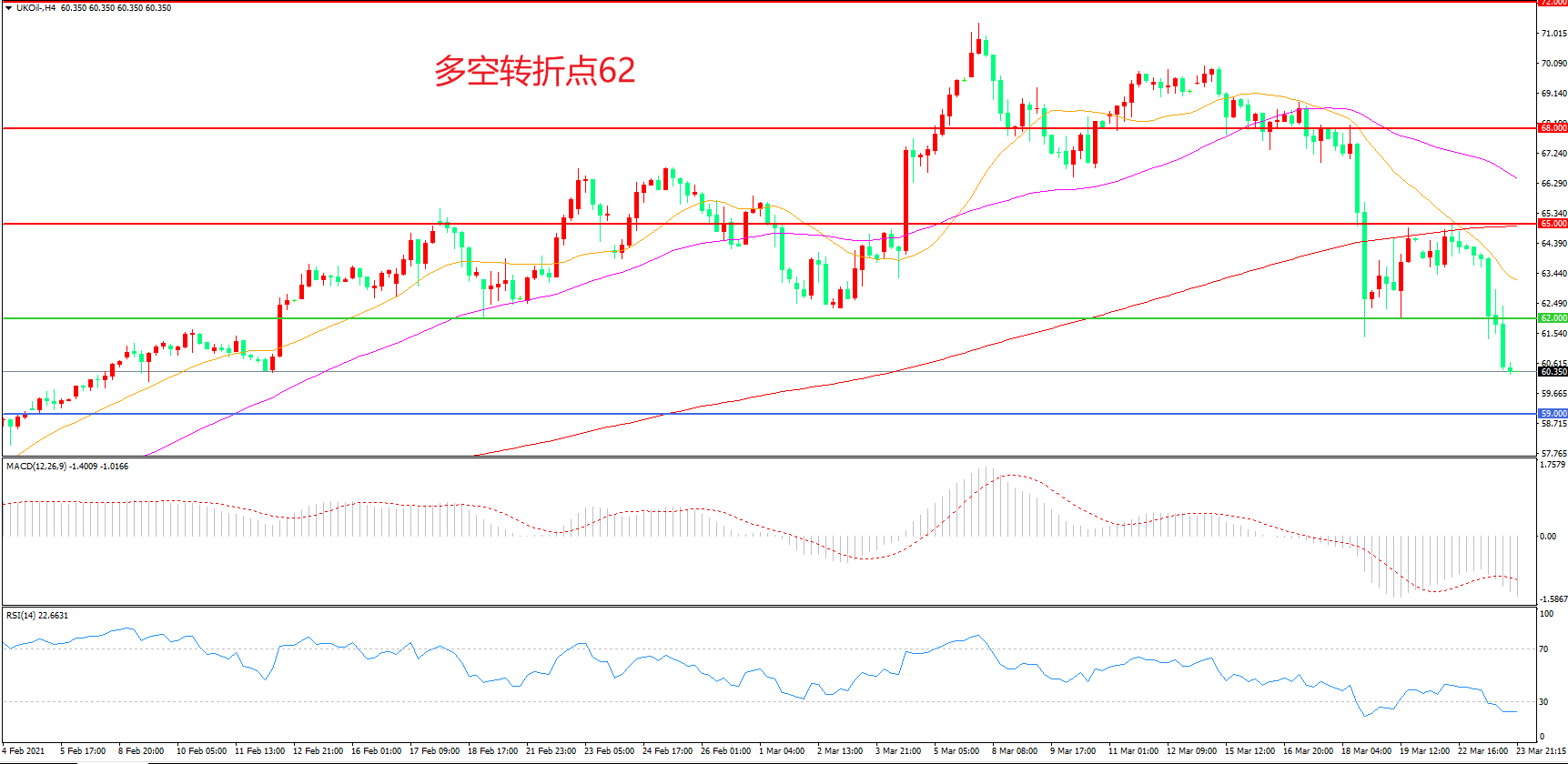 4小时图看,油价高位震荡后长阴破位,前期涨势被吞噬殆尽,整体走势依然偏空,21周期均线形成上方阻力,MACD绿柱增加,RSI指标走平,日内震荡下行概率较大。