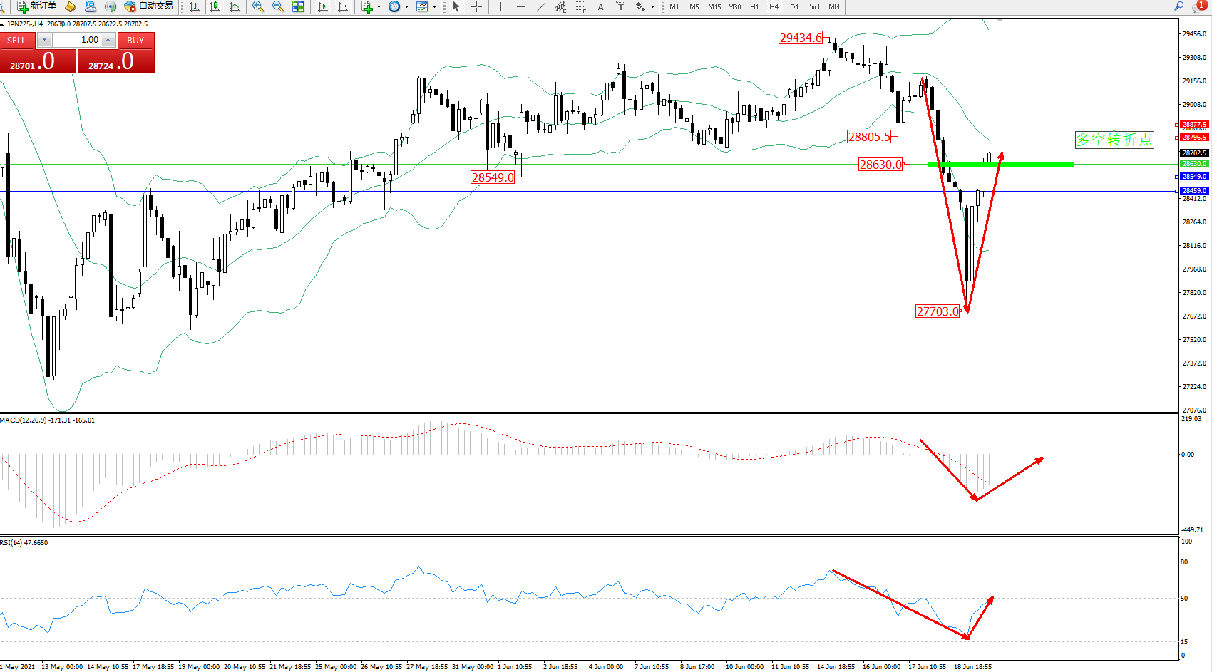 日经指数JPN225——4小时K线图显示: