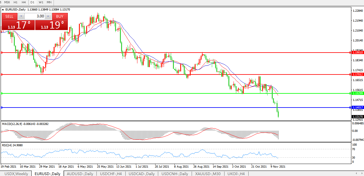 技术面简析:日图均线再度呈空头排列,汇价延续骤跌,MACD运行于0轴下且量能稍微放量,RSI持续下行 ,预计短期汇价大概率将进一步下行。