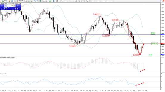 空头动力延续布林带指标下轨持续震荡下行,低位抵达1.30009位置得到短暂支撑开始V型反转上移,触及布林带指标中轨附近节点后开始整理,布林带指标呈张口走势后开始收口,上方压制关注1.33745附近,低位支撑关注1.30009附近,关注1.32090附近转折点,MACD指标处于空头区域维持弱势整理上上扬,RSI指标处于空头区域维持窄幅震荡缓慢上移中,如图:
