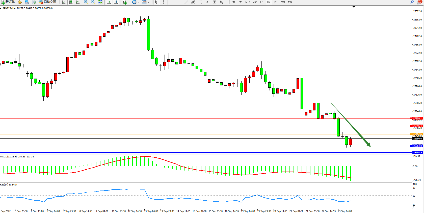 日经指数JPN225——4小时K线图显示: