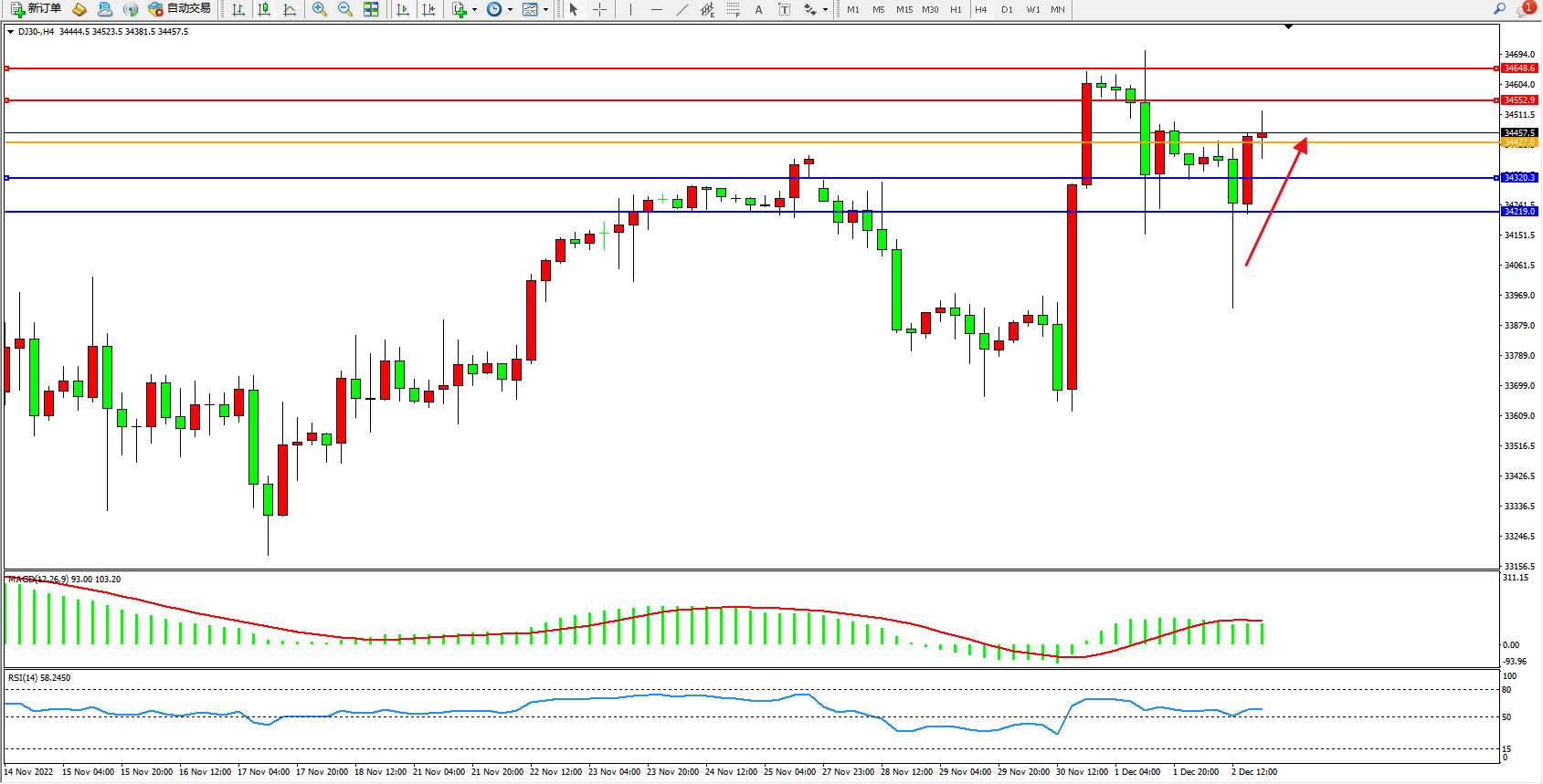 道琼斯指数DJ30——4小时K线图显示: