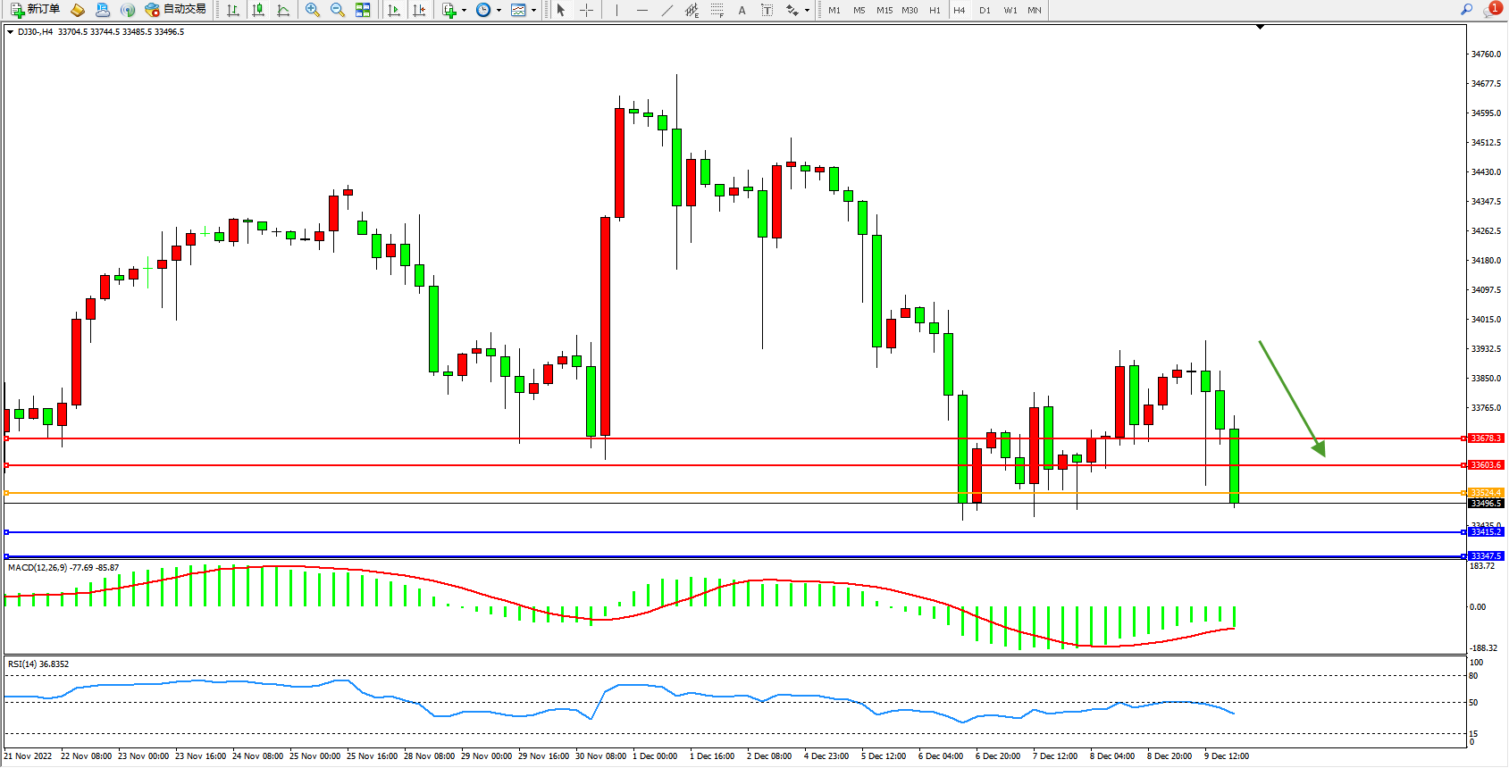 道琼斯指数DJ30——4小时K线图显示: