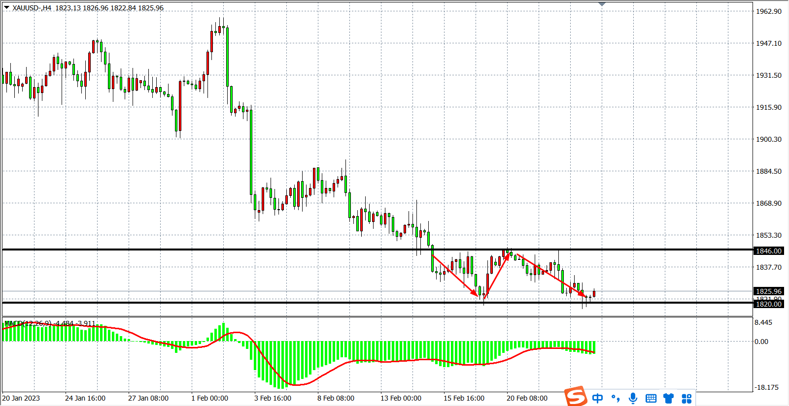 4小时图看,金价回落1820支撑后出现小幅企稳反弹,MACD在零轴之下呈小幅缩量状态,行情短线进入方向选择,区间位于1820-1846,在此区间内首选高抛低吸为主,若跌破下方1820则空头加速,往下看至1800附近。