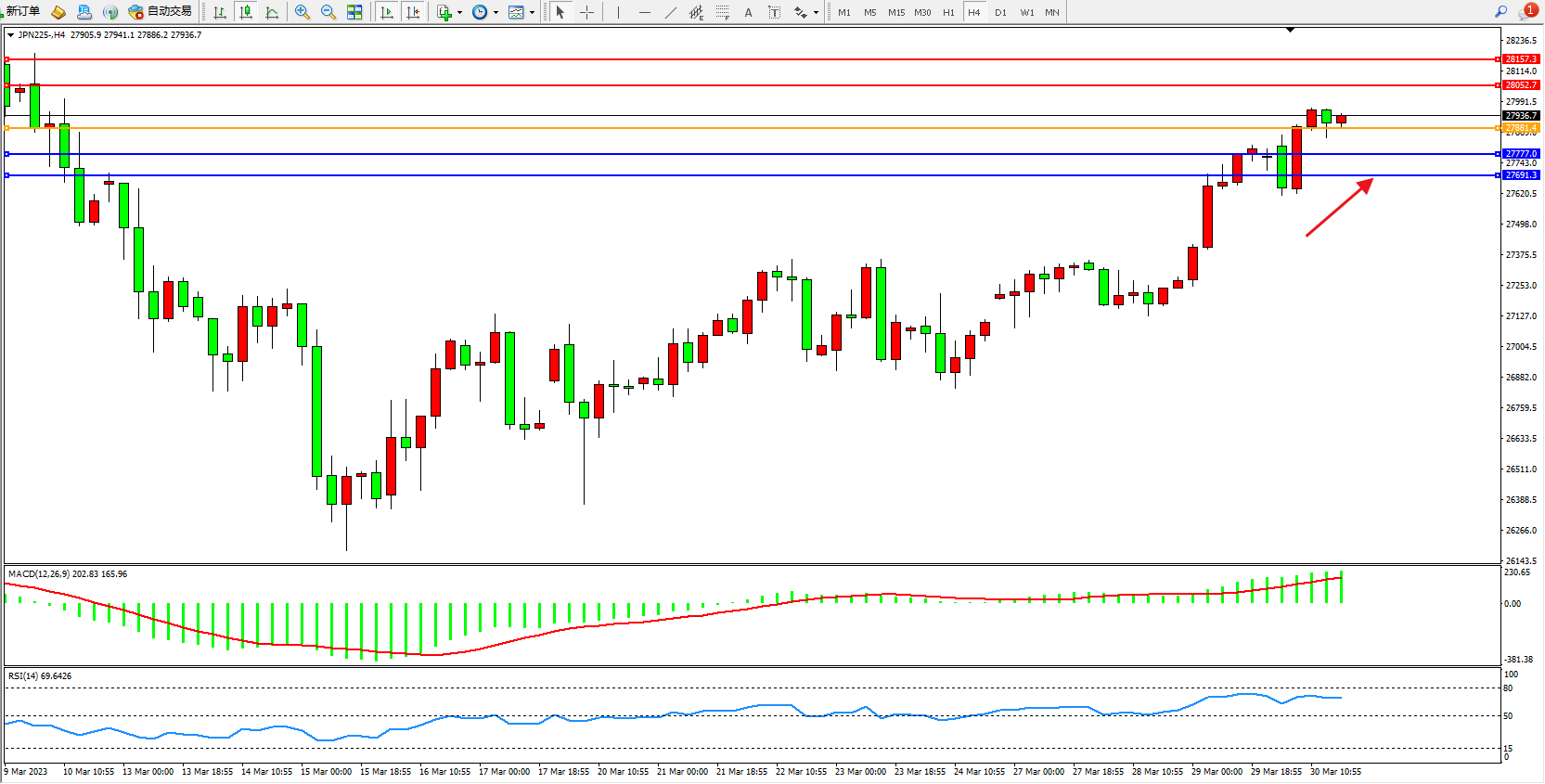 日经指数JPN225——4小时K线图显示: