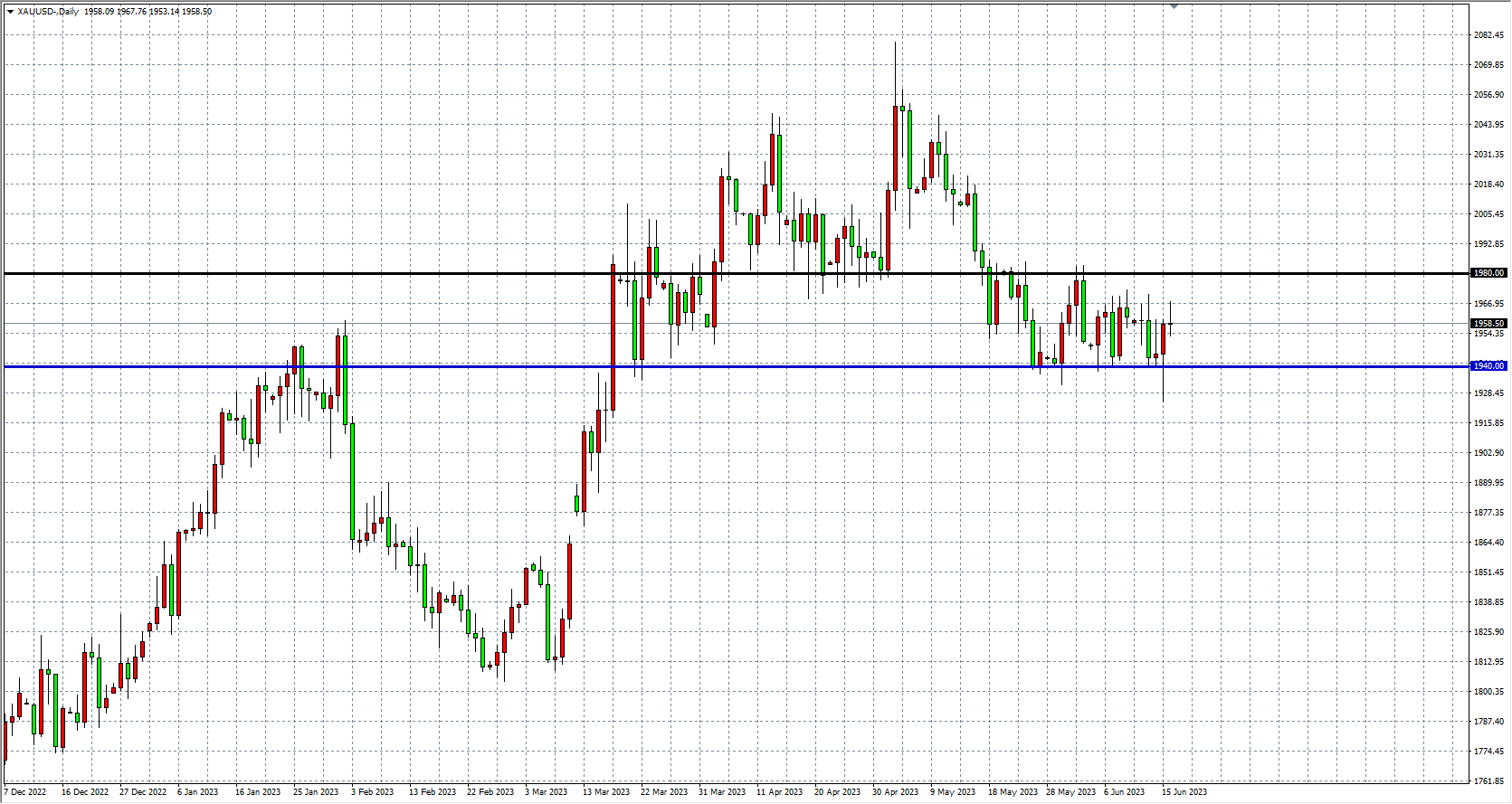 上周(6月12日-6月16日)黄金上演过山车行情,经历大涨大跌后,周线最终仍小幅收跌0.30%。美国5月CPI超预期降温,周二黄金日内巨震30美元,险些失守1940关口。周四凌晨美联储利率决议前,黄金一度涨超16美元并上破1960关口,但决议公布后一路下跌,随后周四晚间因美元和美债收益率双双跳水而大幅拉升,站上1960美元关口,周五仍徘徊在1960美元附近。