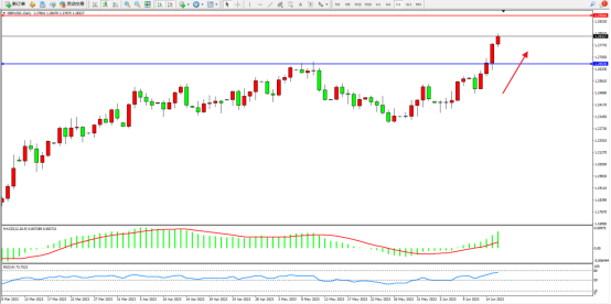 多头动力高位持续上扬,短期看涨情绪依旧,市场多头不断攀升中,上方压制关注1.29564附近,低位支撑关注1.26636附近,MACD指标处于多头区域上移,RSI指标处于多头区域高位上行,如图: