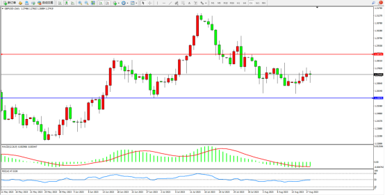 空头动力维持阶梯震荡向下移动,短期得到支撑后震荡,多头动力有伺机入场迹象上方压制关注1.28731附近,低位支撑关注1.25870附近,MACD指标处于空头区域维持整理,RSI指标处于50均衡线附近弱势徘徊,如图: