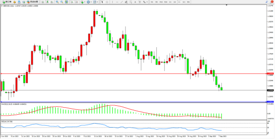 空头动力持续震荡下行,短期跌势或将持续,市场整体空头情绪笼罩,上方压制关注1.25926附近,低位支撑关注1.23521附近,MACD指标处于空头区域低位整理,RSI指标处于空头区域低位震荡;如图: