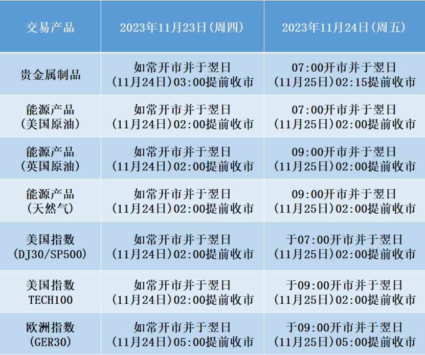 1.外汇货币对和其他股指产品的交易不受本次美国感恩节假期休市影响。