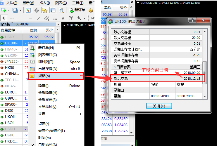 2.在报价窗口右击交易品种,选择规格即可查看该品种详细合约细则,如下图操作