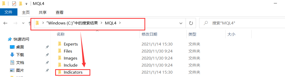 1.下载文件后,将解压后的问题复制到安装的MT4的\MQL4\Indicators,若找不到该路径在安装的位置搜索MQL4文件夹,例如默认安装在C盘,在C盘搜索MQL4,搜索出文件夹后双击打开后找到Indicators,并将下载的MACD双线指标粘贴到Indicators文件夹,如下图: